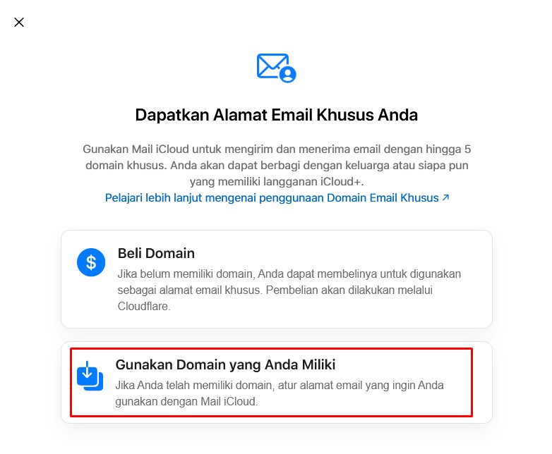 - Selanjutnya silakan pilih Gunakan domain yang Anda miliki.