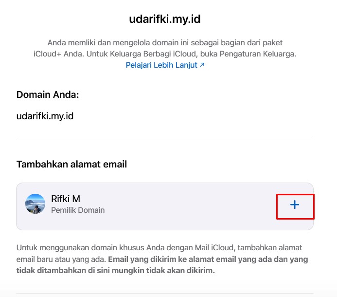 - Selanjutnya silakan pergi ke halaman https://www.icloud.com/icloudplus/ lalu klik pada Email Domain Khusus, klik pada domain yang sudah ditambahkan. Lalu klik ikon + untuk menambahkan email.